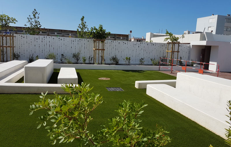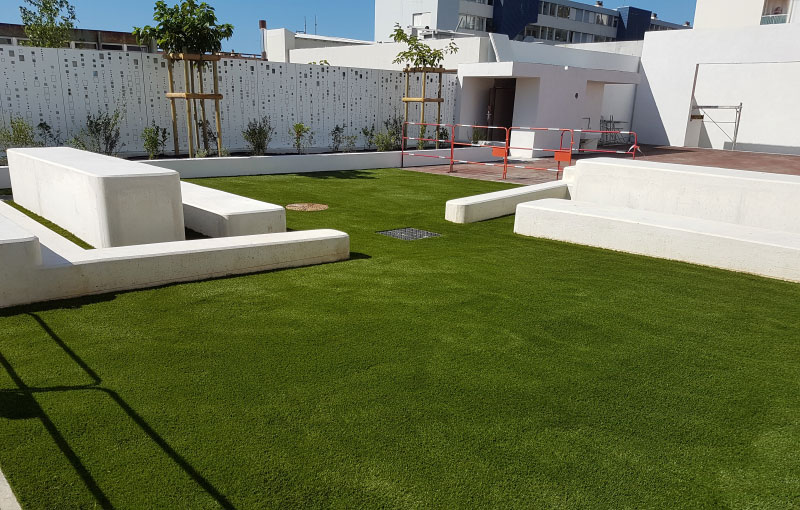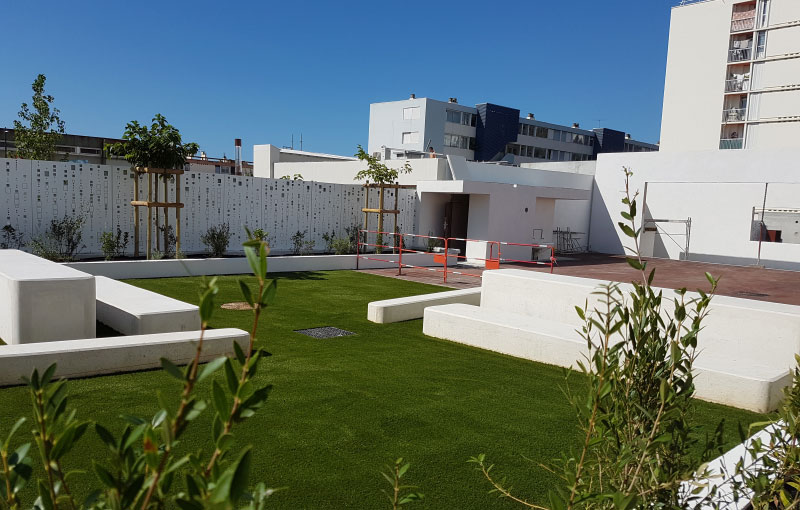 L’envie de notre client était de réaliser un espace convivial, design et très facile d’entretien au vues de la forte fréquentation du lieu. Avec un fort passage des étudiants, la gazon synthétique s’avère un revêtement de sol extérieur idéal grâce à son entretien plus facile et sa nature moins fragile que le gazon naturel.