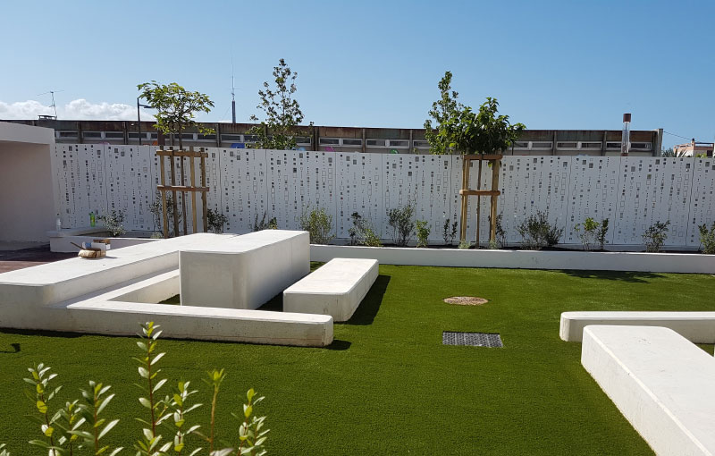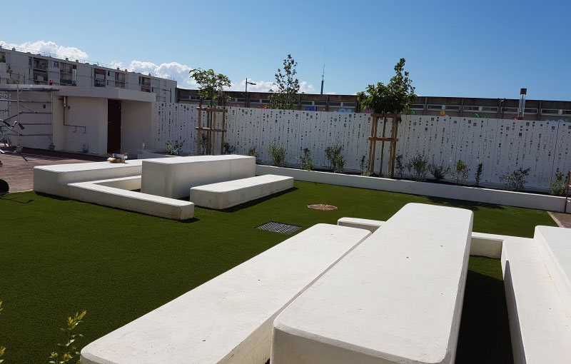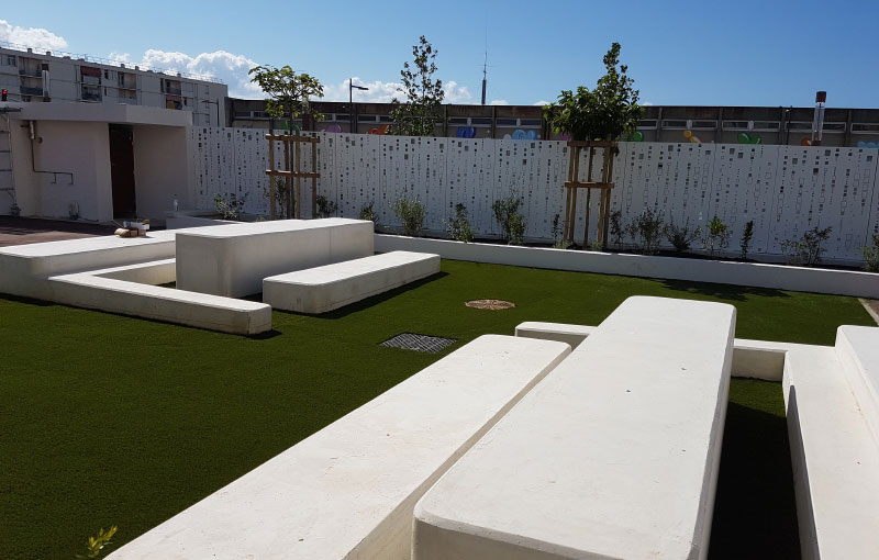 Vente Green a réalisé l’aménagement complet : des plans à la livraison clés en main. Notre équipe de professionnels a tout d’abord préparé le terrain avant de poser les lés de gazon synthétique. Nous avons ensuite pensé à créer un espace extérieur design et agréable en installant des bancs originaux.