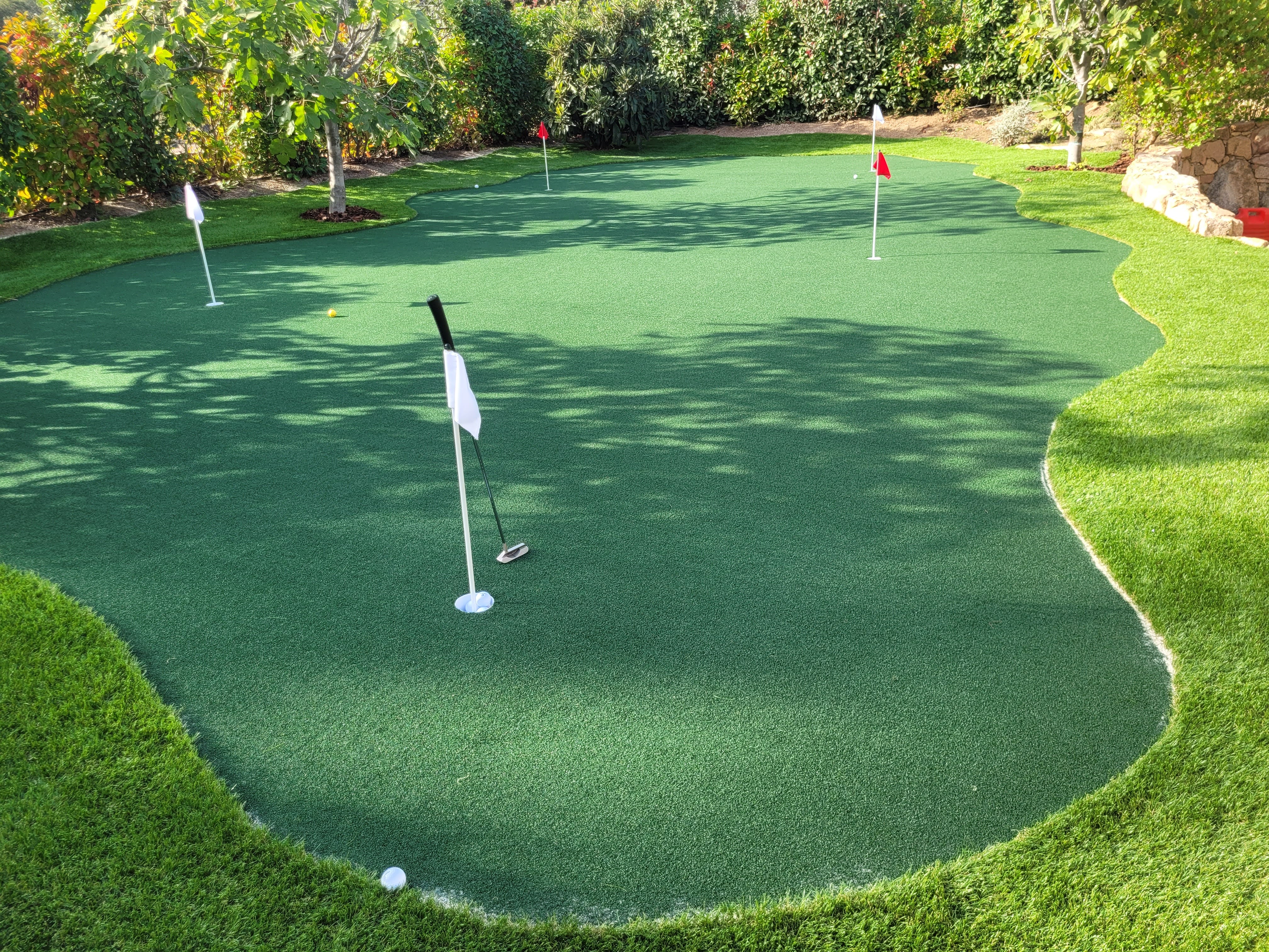 Notre gazon synthétique apporte le même plaisir de jeu que sur un vrai green puisqu’il est conçu pour garder la vitesse de roulement et l’amorti de la balle de golf. De plus, il apporte un côté design au terrain de mini golf puisqu’il peut se découper selon les formes désirées. Il est également possible de réaliser un green synthétique avec la pose de gazon synthétique sur un parcours de golf. Cela permet un entretien beaucoup plus simple et moins onéreux : pas de tonte de gazon, pas d’arrosage, ni pose de système d’arrosage spécifique.