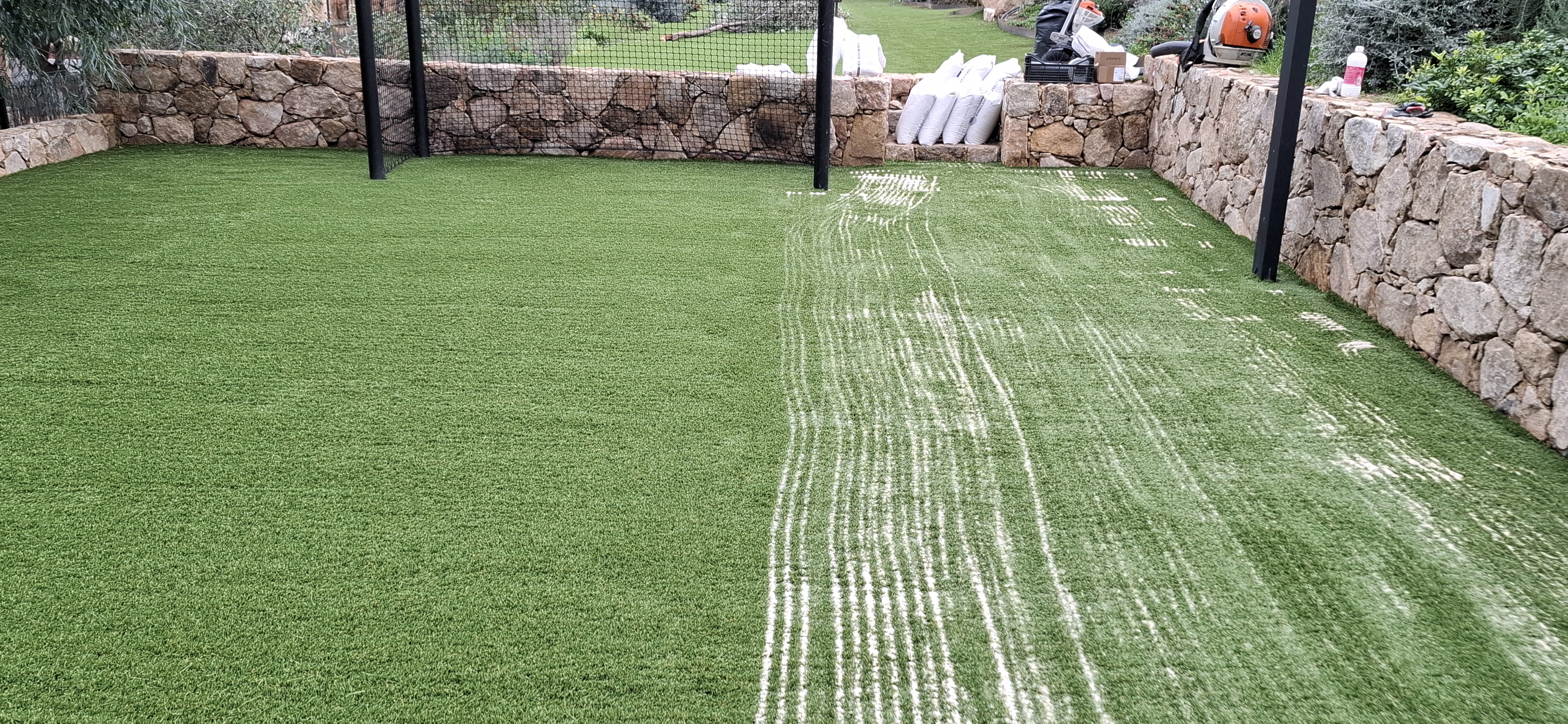 Notre équipe de professionnels a mis en place cette réalisation de A à Z : mise en forme du terrain, pose de feutre géotextile, pose de gazon synthétique et apport de sable stabilisé. Notre client souhaitait un terrain multi sports pratique, facile d’entretien et design. Nous avons donc choisit le gazon synthétique EVIA 45 mm adapté à la pratique du sports.